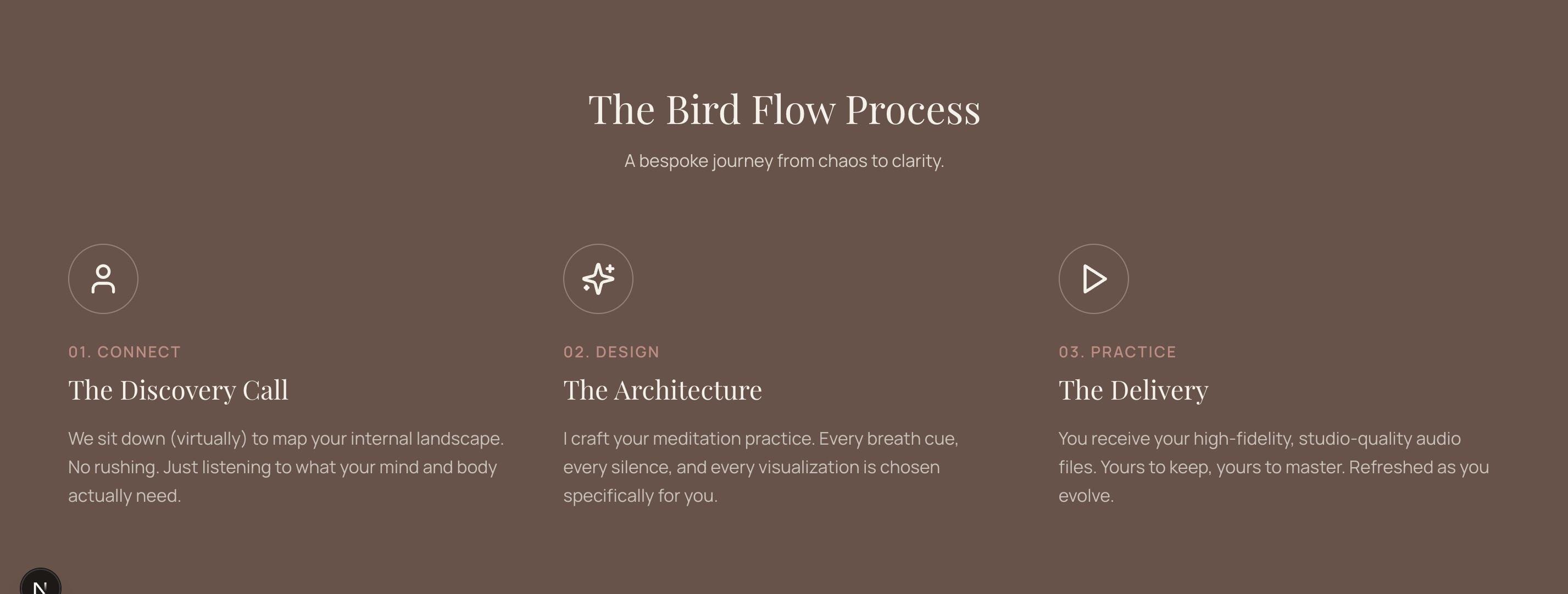 Standard meditation apps ask you to follow their path. Bird Flow builds the path beneath your feet—science-backed, deeply personal meditation design rooted in who you actually are.
