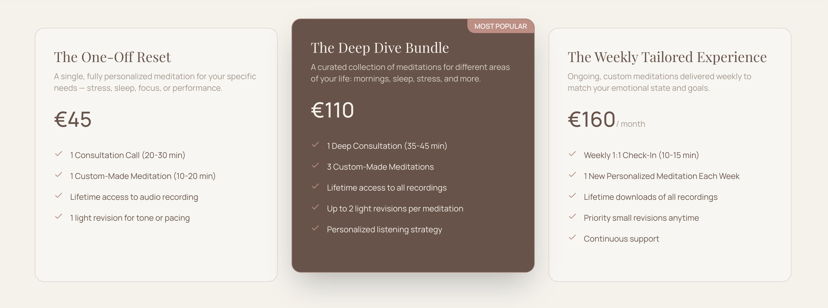 Select the depth of personalization that serves you. All packages include a 1-on-1 free discovery consultation.